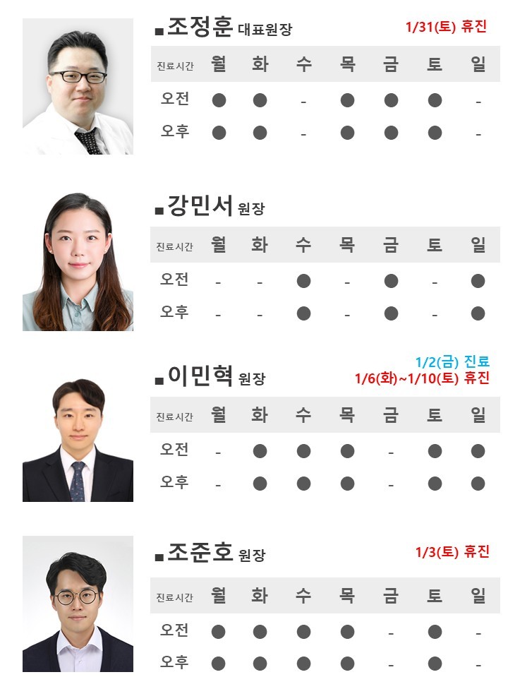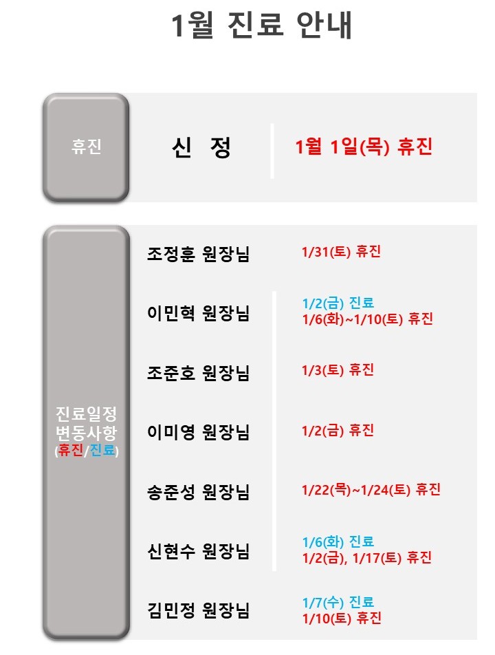 진료안내상담예약 유바외과 소개 진료안내 유방클리닉 갑상선클리닉 온라인상담실 알림판 유바외과 소개 유바외과의 신념 유바외과의 특별함 유바외과 의료장비 의료진 소개 찾아오시는 길 부설 진료협력센터 진료안내 가상진료체험 상담예약 진료비 안내 의무기록 신청 유방클리닉 유방암의 이해 유방암 검진 유방 조직검사 맘모톰 수술 석회화 조직검사 갑상선클리닉 갑상선암의 이해 갑상선암 검진 갑상선 조직세포검사 고주파 열치료술 온라인상담실 의료상담 내원후기 알림판 공지사항 유바활동 의학칼럼 카테고리 상품 검색 카테고리 홈 알림판 유바외과 소개 진료안내 유방클리닉 갑상선클리닉 온라인상담실 알림판 공지사항 공지사항 유바활동 의학칼럼 공지사항 Home > 알림판 > 공지사항 유바활동 의학칼럼 상담예약 갤러리게시판 공지사항 의료상담 내원후기 1월 진료안내 관리자2026.01.05 1/1(목) 신정 휴진입니다. 진료 예약 및 내원에 착오 없으시길 바랍니다. 목록 TOP