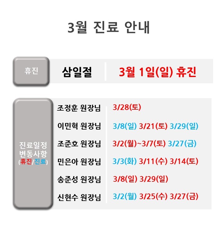 진료안내상담예약 유바외과 소개 진료안내 유방클리닉 갑상선클리닉 온라인상담실 알림판 유바외과 소개 유바외과의 신념 유바외과의 특별함 유바외과 의료장비 의료진 소개 찾아오시는 길 부설 진료협력센터 진료안내 가상진료체험 상담예약 진료비 안내 의무기록 신청 유방클리닉 유방암의 이해 유방암 검진 유방 조직검사 맘모톰 수술 석회화 조직검사 갑상선클리닉 갑상선암의 이해 갑상선암 검진 갑상선 조직세포검사 고주파 열치료술 온라인상담실 의료상담 내원후기 알림판 공지사항 유바활동 의학칼럼 카테고리 상품 검색 카테고리 홈 알림판 유바외과 소개 진료안내 유방클리닉 갑상선클리닉 온라인상담실 알림판 공지사항 공지사항 유바활동 의학칼럼 공지사항 Home > 알림판 > 공지사항 유바활동 의학칼럼 상담예약 갤러리게시판 공지사항 의료상담 내원후기 3월 진료안내 관리자2026.02.20 3/1(일) 삼일절 휴진입니다. 진료 예약 및 내원에 착오 없으시길 바랍니다. 목록 TOP