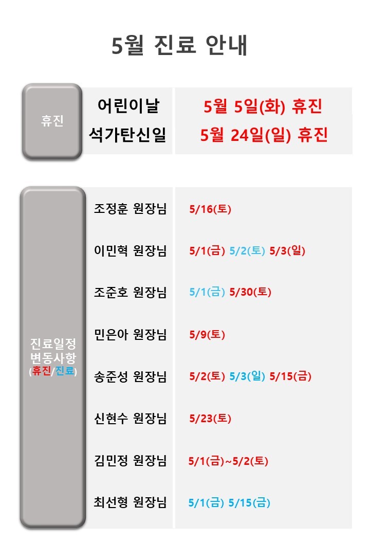진료안내상담예약 유바외과 소개 진료안내 유방클리닉 갑상선클리닉 온라인상담실 알림판 유바외과 소개 유바외과의 신념 유바외과의 특별함 유바외과 의료장비 의료진 소개 찾아오시는 길 부설 진료협력센터 진료안내 가상진료체험 상담예약 진료비 안내 의무기록 신청 유방클리닉 유방암의 이해 유방암 검진 유방 조직검사 맘모톰 수술 석회화 조직검사 갑상선클리닉 갑상선암의 이해 갑상선암 검진 갑상선 조직세포검사 고주파 열치료술 온라인상담실 의료상담 내원후기 알림판 공지사항 유바활동 의학칼럼 카테고리 상품 검색 카테고리 홈 알림판 유바외과 소개 진료안내 유방클리닉 갑상선클리닉 온라인상담실 알림판 공지사항 공지사항 유바활동 의학칼럼 공지사항 Home > 알림판 > 공지사항 유바활동 의학칼럼 상담예약 갤러리게시판 공지사항 의료상담 내원후기 5월 진료안내 관리자2026.04.09 5/5(화) 어린이날, 5/24(일) 석가탄신일 휴진입니다. 진료 예약 및 내원에 착오 없으시길 바랍니다. 목록 TOP