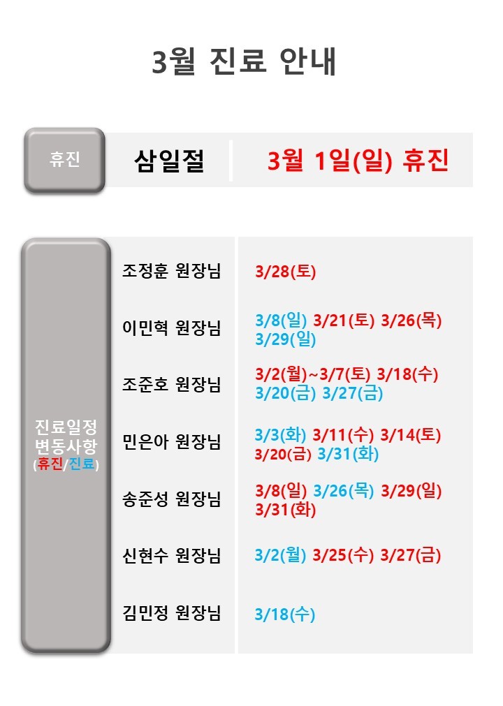 진료안내상담예약 유바외과 소개 진료안내 유방클리닉 갑상선클리닉 온라인상담실 알림판 유바외과 소개 유바외과의 신념 유바외과의 특별함 유바외과 의료장비 의료진 소개 찾아오시는 길 부설 진료협력센터 진료안내 가상진료체험 상담예약 진료비 안내 의무기록 신청 유방클리닉 유방암의 이해 유방암 검진 유방 조직검사 맘모톰 수술 석회화 조직검사 갑상선클리닉 갑상선암의 이해 갑상선암 검진 갑상선 조직세포검사 고주파 열치료술 온라인상담실 의료상담 내원후기 알림판 공지사항 유바활동 의학칼럼 카테고리 상품 검색 카테고리 홈 알림판 유바외과 소개 진료안내 유방클리닉 갑상선클리닉 온라인상담실 알림판 공지사항 공지사항 유바활동 의학칼럼 공지사항 Home > 알림판 > 공지사항 유바활동 의학칼럼 상담예약 갤러리게시판 공지사항 의료상담 내원후기 3월 진료안내 관리자2026.02.20 3/1(일) 삼일절 휴진입니다. 진료 예약 및 내원에 착오 없으시길 바랍니다. 목록 TOP